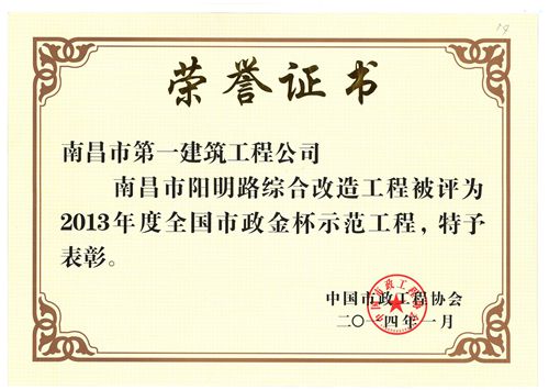 日前,由南昌市一建公司承建的陽明路改造工程,榮獲全國市政工程最高獎“全國市政金杯示范工程獎”。